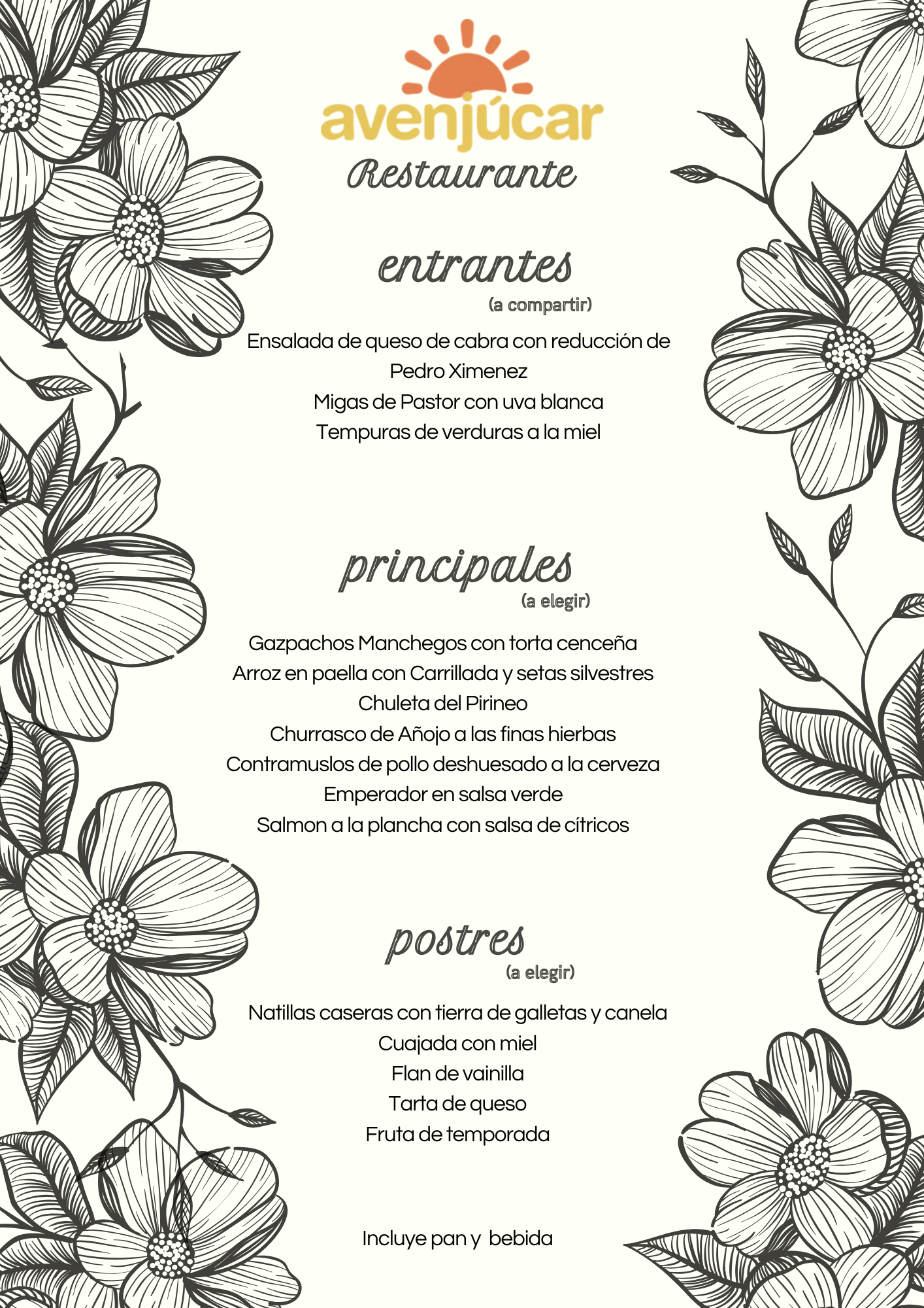 Tenemos MENÚ con varias opciones a elegir, creado cada semana por nuestro chef y compuesto por varios entrantes y principales para escoger tu favorito, por supuesto también incluye postre y bebida.
